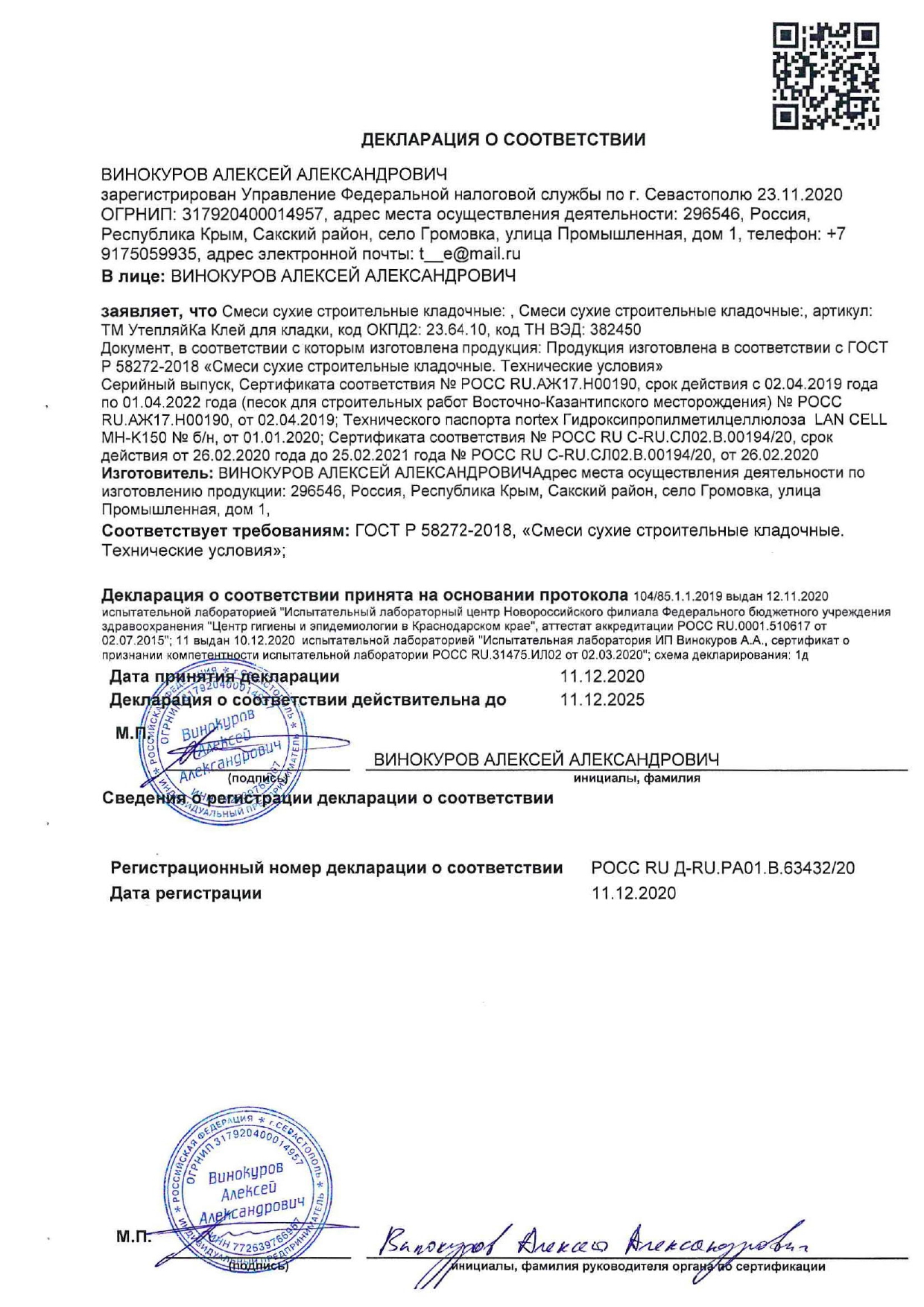 | 20 | Декларация соответствия | Утепляйка — Смесь М150 | Декларация | JPG | Открыть Скачать |
