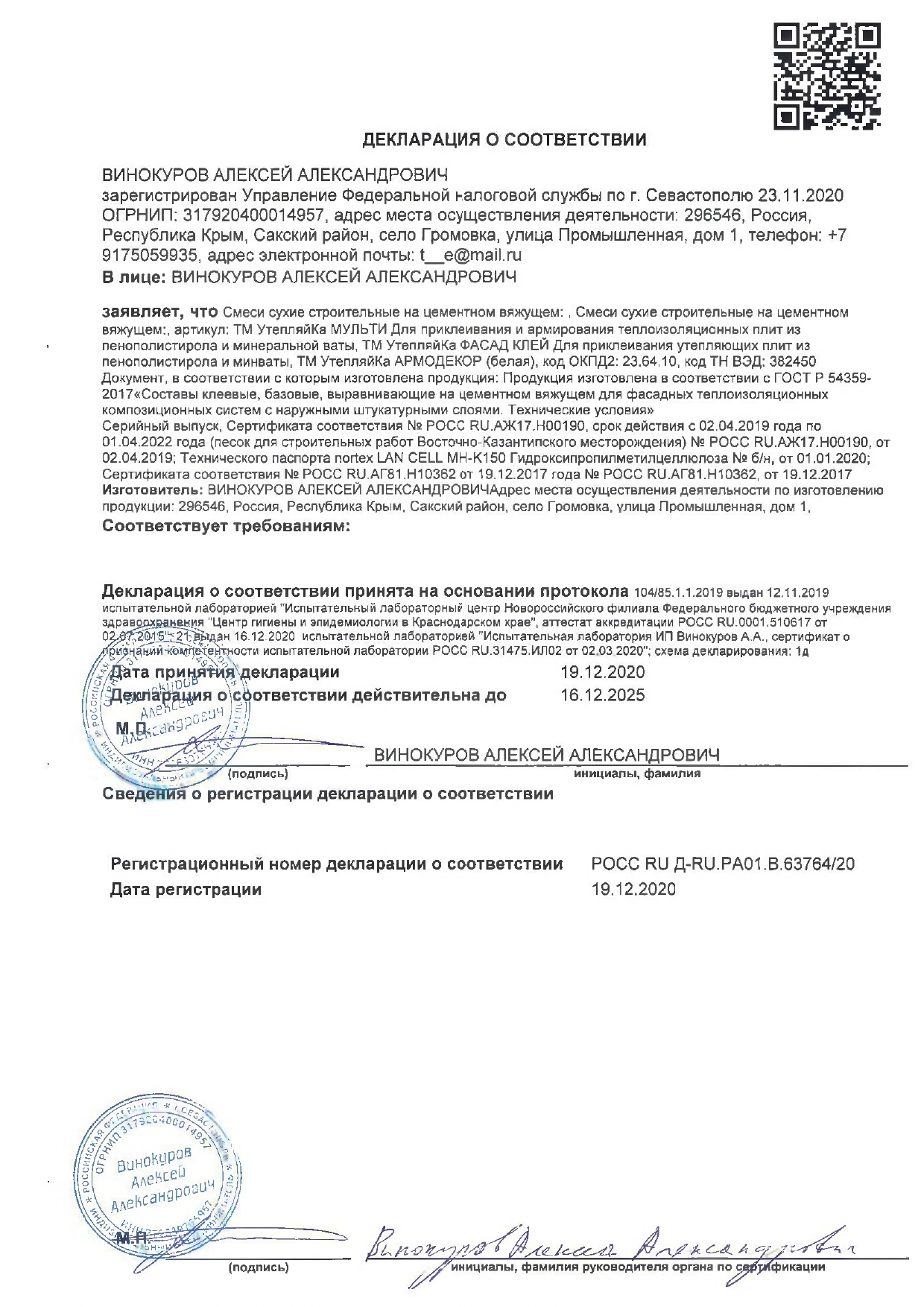 | 22 | Декларация соответствия | Утепляйка — Смесь теплоизол. | Декларация | JPG | Открыть Скачать |